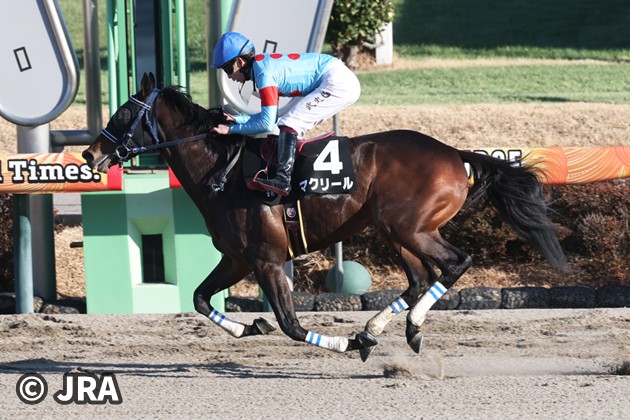 デビュー前から調教で動いており、25年10月の新馬戦では圧倒的1番人気に支持された。しかし、先に抜け出した勝ち馬を捉え切れず2着に惜敗。それでも最後に見せた伸びはすさまじく、2戦目ではあっさりと勝利。それも2着馬は直後に勝利すると、続くブルーバードカップ(JpnIII)も勝利した。「2戦目でパシュファイヤーを着用したら好時計勝ちをしてくれました」と手塚貴久調教師。前走の黒竹賞は序盤、後方からの苦しい競馬になったが、終わってみればここも楽々と抜け出した。手綱を取った横山武史騎手は「距離が伸びて右回りも初めて。後方からになって砂を浴び、決して楽な競馬ではなかったけど、最後は良い脚で突き抜けてくれました」と笑顔で語った。重賞でも勝ち負けになる器だろう。