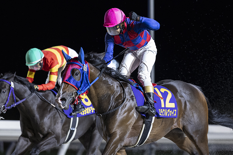 迎えた3コーナー。3番手で機を窺っていたベラジオドリームが進出開始。直線入口では絶好の手応えで前に並びかけ、そのまま先頭に躍り出る勢いがあった。しかし、その勢いに待ったをかけたのが、今回はスタートが決まり、いつもより良い6~7番手の位置が取れていたミラクルヴォイスだ。ベラジオドリームを追い掛け直線で並びかけると、そこからは両馬の一騎打ち。残り50メートルで相手を競り落としたミラクルヴォイスが先頭でゴールしたとき、鞍上の松井伸也騎手はやや控えめに、しかし力強く握られた左の拳を挙げ、勝利をアピールした。1馬身差の2着にベラジオドリーム。更に1馬身半差の3着には、後方から追い上げたエイシンマジョリカが入った。