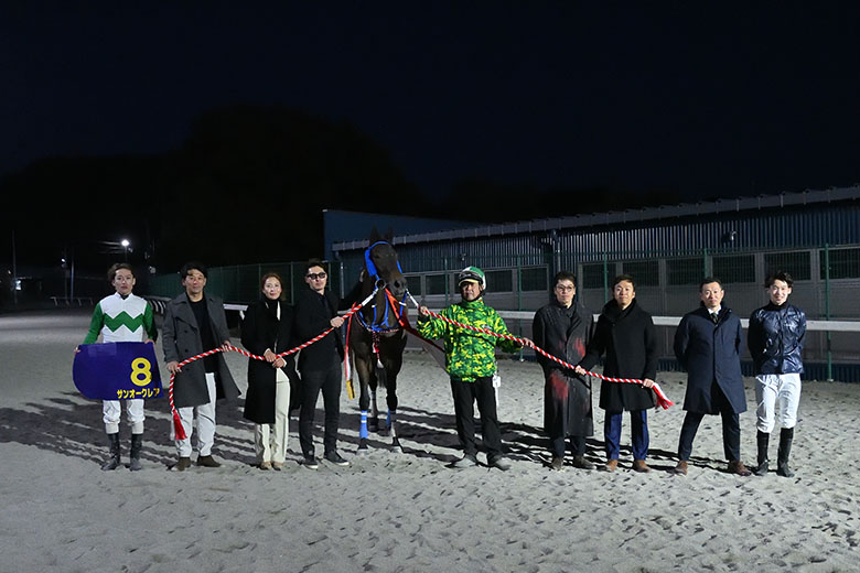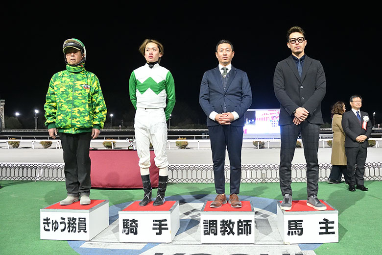勝利を馬主とともに喜んでいたのが、門別所属時に管理していた五十嵐冬樹調教師。久根本英男厩務員も「前走のあとから状態が良くなりました。遠くから来た甲斐がありました」と笑顔を見せた。