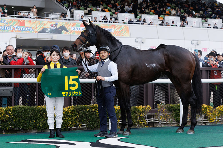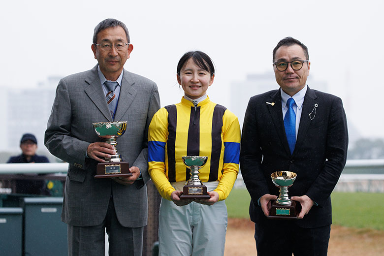 ダート1400メートルの第2戦は、塩津璃菜騎手(兵庫)が興奮のレースを見せた。好ダッシュをつけて好位から運んだトルーマンテソーロが、直線で一歩ずつ着実に伸びて4頭横一戦のゴールをハナ差で制した。これが地方所属女性騎手としてJRA初勝利となった。過去には、山本泉騎手(新潟)、佐々木明美騎手(北海道)による2着(ともに1999年)はあったが、NAR設立後、60名を超える女性騎手がデビューした中で初の快挙。