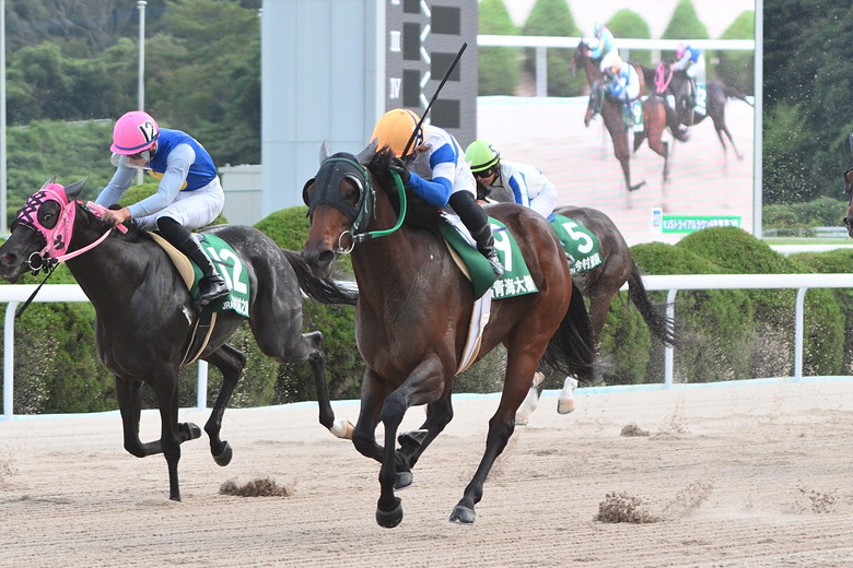 芝2000メートルの中京第1戦は、ハナを主張した古川騎手に、神尾騎手が競りかけ3番手以下を離す展開。競り合った前2頭には厳しい展開に思われたが、直線で振り切った古川騎手が粘り込んだ。YJS・FRで女性騎手の勝利は初めてだった。
