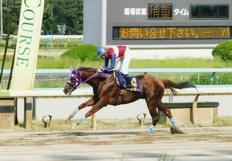 7歳の癖馬が金沢に来たのは2003年の秋。中央では45戦6勝のオープン馬だった。「中央の騎手に聞くと、乗り手に歯向かうし、手に負えない」。レースを見ても、後方待機から直線勝負ばかり。恐る恐る乗っているのが伝わってきた。到着後、実際の姿を見ると左目が白内障で、右前脚に屈腱炎の兆候も見られた。前途多難が予想されたが、松原正文調教師の懸命の立て直しで、移籍初年は重賞の北國王冠、中日杯を含む3戦3勝。元中央オープンの看板は伊達ではなく、中日杯は後続を大差で下し、力の違いで年度代表馬に選出された。ただ、折り合い難は中央時と変わりはなかった。