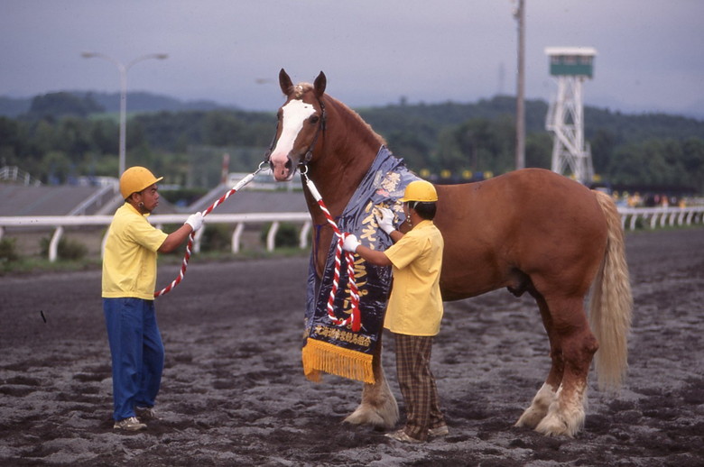 岩見沢は1986(昭和61)年7月に初めてばんえい競馬を観戦したところ。岩見沢駅から競馬場へ向かう送迎バスに次から次へと年配のご婦人方が乗りこんできて、口々に「きょうはキンタローが出るから見にいかなきゃ」と言っていた。「へぇ~、そんなスターホースがいるんだ」と思ったら、その馬が直後にばんえい初の“1億円馬”になった。