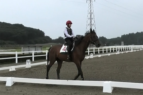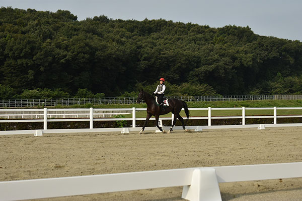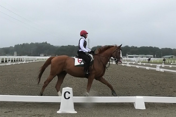 今回の技能審査では、良い感じの前進気勢を作る事が出来ました。ですが一番自分の中の課題にしていた所が上手くできませんでした。手前をかえた後の隅角で右手前の姿勢を作ってあげて隅角を深く曲がる事が出来ていないところがほとんどだったので、馬の弱点を補えるようにしたいです。